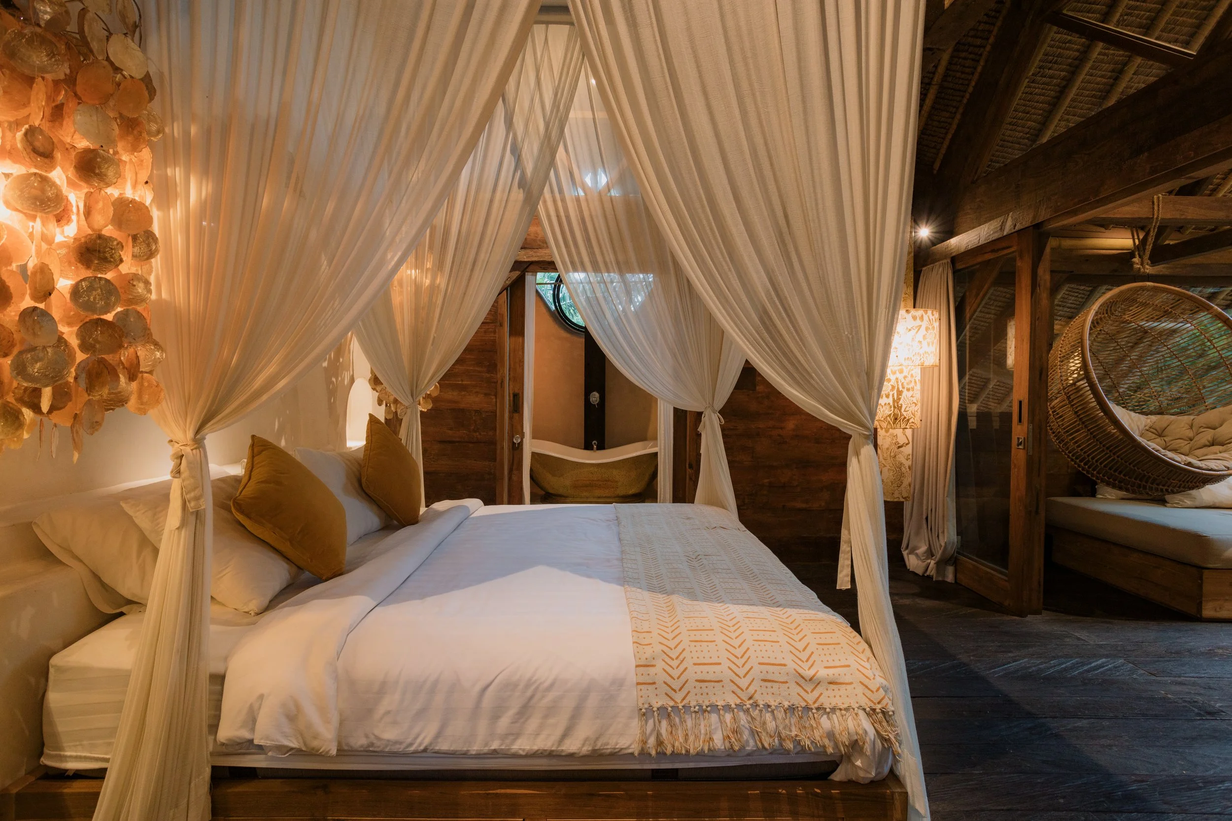 This bedroom has a king sized bed with ensuite bathroom with bathtub and airconditioning. There’s also a small walk-in closet. The master bedroom can be connected to the indoor living space/TV room or closed off with sliding doors.